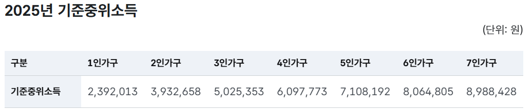8인 이상 가구는 7인가구 기준 중위소득에 6인가구와의 차액을 가구원 수만큼 더해 산정한다. 기준 중위소득 100%라는 표현 때문에 높게 느껴질 수 있지만, 실제 급여 선정 기준은 이보다 훨씬 낮은 비율에서 적용된다.