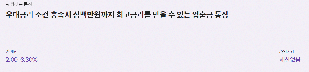 - 다올저축은행 Fi 쌈짓돈 통장: 3백만원 이하 최대 연 3.30%(우대 포함)