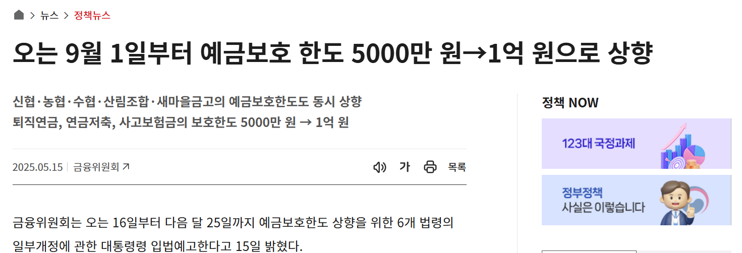 예금자보호 한도가 2025년 9월 1일부터 5천만 원 → 1억 원으로 상향되는 내용이 정부 보도자료/정책브리핑에 안내돼 있습니다.