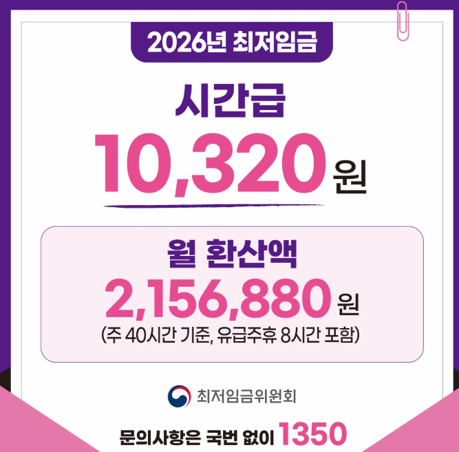 2026년 최저임금은 시급 10,320원,