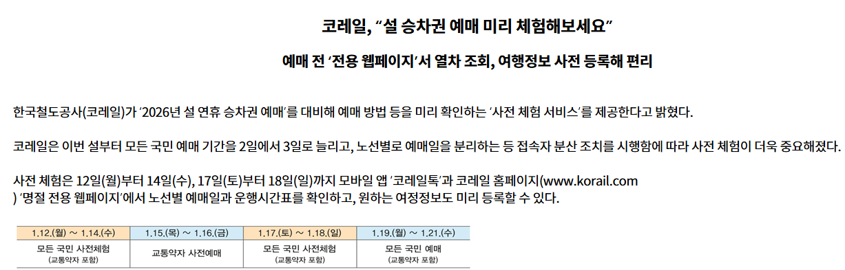 2) 코레일(KTX) 2026 설 승차권 예매 일정
